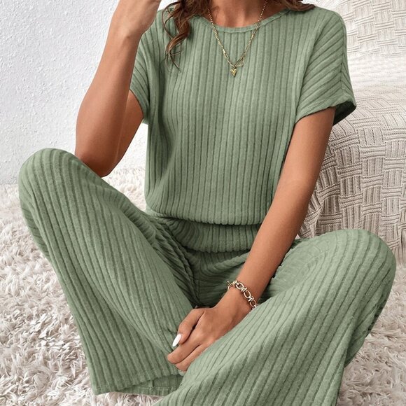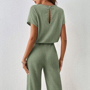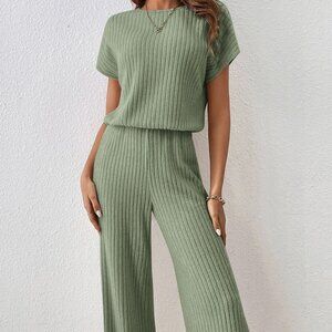 Grass Green Solid Color Ribbed Short Sleeve Wide Leg