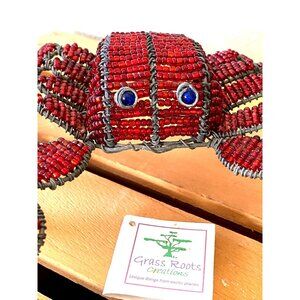 Handcrafted work of art in Africa. This red designed wire crab has beaded blue eyes and measures 7 inches in length and 2.5 inches high. Also included is the matching clam shell which measures. Clam shell has a few signs of wear but I am just selling them together.