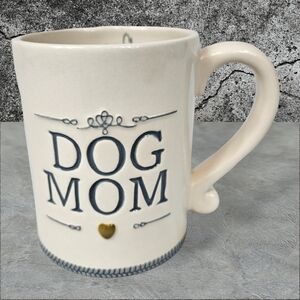 It is a special type of mom that is a dog mom. This "Dog Mom" Mug holds a generous 14 ounces and features embossed statement and sculpted heart with details and braided base on white glossy stoneware. Woof with paw print on interior lip of coffee mug tea cup. Light weight, slim ceramic mug with large easy to grip handle stands. Perfect gift for the fur mom! Dishwasher and microwave safe.