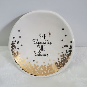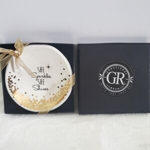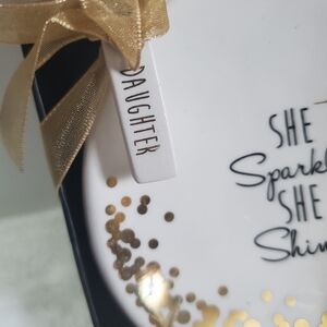 NIB Grasslands Road She Sparkles She Shines Daughter Ceramic Gold Trinket Dish. 4" x 4" circle shaped ceramic dish, white with gold accents, black writing image, rectangular ceramic "Daughter" tag, wrapped in a gold ribbon. Great for gift giving! Brand new in box!