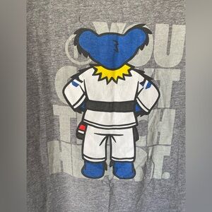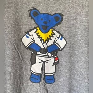 Gray t-shirt featuring a blue bear Grateful Dead graphic. A great addition to a collection. In used condition with a blue spot (see photos). Plenty of life yet to be lived.