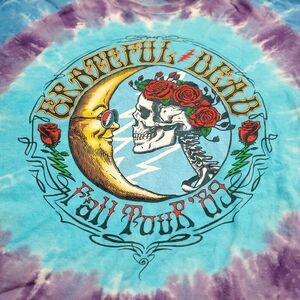 This vintage Y2K Grateful Dead Liquid Blue tie-dye shirt features the Fall Tour of 1989 graphic print with moon roses and skulls, making it a unique and eye-catching addition to any collector's wardrobe. Made of comfortable cotton knit material, this short sleeve t-shirt has a crew neck and a regular fit, perfect for both men and women. The blue color and logo accents add to the overall design, appealing to fans of the band and collectors of vintage clothing. Machine washable and suitable for all seasons, this shirt is a must-have for any Grateful Dead enthusiast.