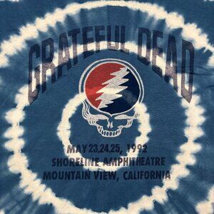 Grateful Dead blue and white tie-dye oversized T-Shirt Size Medium featuring iconic band graphics. Measures 23” pit to pit and 26” long. Perfect for Deadheads and vintage rock lovers.