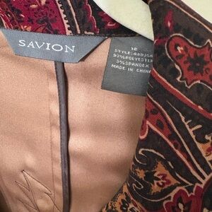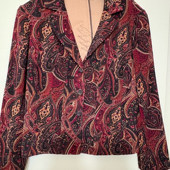 Upcycled paisley blazer with button closure. Features a mix of red, black, and brown tones. Material is soft felt-like with a satin lining