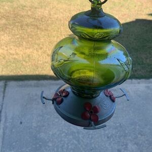 Grateful Gnome - Hummingbird Feeder - Hand Blown Glass - Green Hummingbird