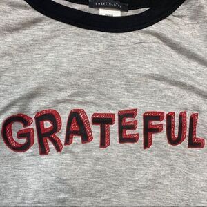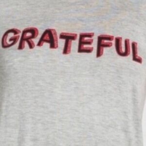 “Grateful” Graphic Print Tee. Gray with black trim and cool lettering. Very soft and high quality material. Crew neck style. Pics with measuring tape are size M.