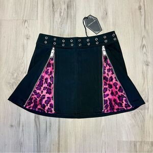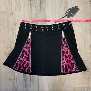 Grave Girls x Dolls Kill black miniskirt with fuzzy pink animal print pleats szS. New with tags, only taken out of package to photo. Slight stretch. Center back zip. Two front zippers reveal pink fuzzy animal print pleats. Silvertone grommets at waist. Size S. Sold out on Dolls Kill site. Measurements in photos.