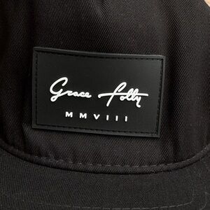 Grace Folly Hat Unisex Snap Back One Size MMVIII Stylish black trucker hat featuring a signature patch on the front. Perfect for casual wear.