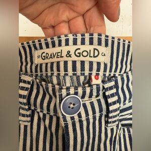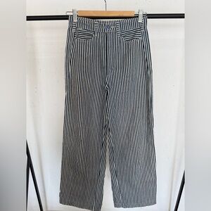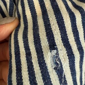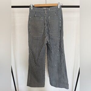 Placer Pants in Conductor Stripe; slight wear/loose threads on crotch seam (see photo) but can be easily stitched/repaired.