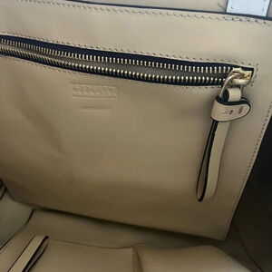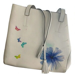 Fratelli and Rossetti white bucket bag. This bag has a flower and butterfly design. It’s in very good condition outside with a few marks (see the pictures) and the inside is perfect. It’s 24” tall, 6.5” wide, 16” from where the straps attach to the purse to the end of the tassel.