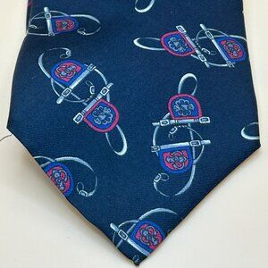 Add a touch of timeless elegance to your wardrobe with this 100% silk tie from Graves Cox & Company, a Lexington, KY establishment since 1888. Featuring an equestrian-inspired design with horse bit and bridle motifs in a deep navy background accented by red and blue details, this tie is perfect for horse lovers and fans of classic Southern style. Whether paired with a suit for a formal event or worn to celebrate Lexington's rich equestrian heritage, this tie is a sophisticated choice. Excellent craftsmanship and luxurious silk make it a must-have addition to any collection.