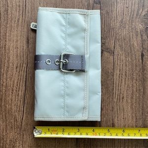 Inside has one non-zip pouch, one zip closure in addition to card slots. One zip closure on back.
