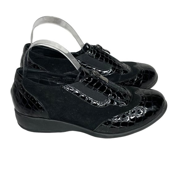 Gravity Defyers black patent suede brogue wingtips with zip closure.
