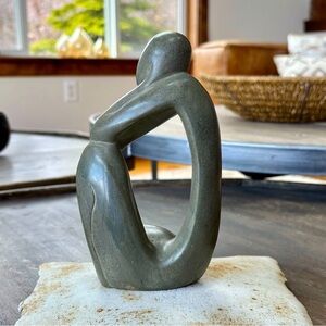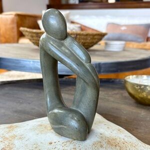 This captivating gray sculpture showcases a minimalist design with smooth, flowing curves that create a sense of movement and connection. Crafted from stone, its polished surface and harmonious form embody modern abstract art, making it a striking addition to any space.