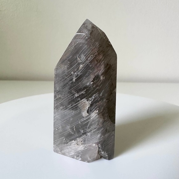 Beautiful gray Amphibole Quartz tower. This piece has fibrous inclusions and shimmering inclusions when the light hits.