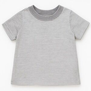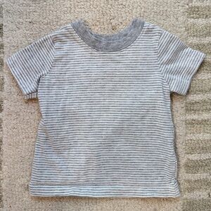 Soft gray and white striped short sleeve shirt by Carters, size 6 months. Features a cozy heathered neckline and breathable cotton fabric, perfect for warm weather or everyday wear.