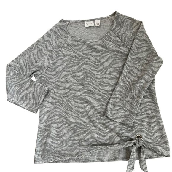 Grey 3/4 sleeve burnout top, not see-through. Ornamental tie on hem. Worn once. Chico's Weekends size 1