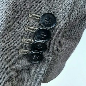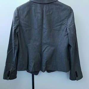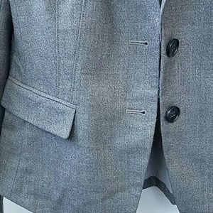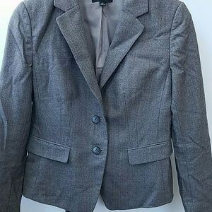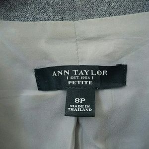 Gray Ann Taylor blazer, 8p, in good condition. Actual color is gray, with subtle brown and black undertones. Wool mix. Dry clean only. Only blemish is slight perspiration stain on inside under collar, not visible when worn. It is visible in picture of tag with size on it. Pet-free smoke-free home. NO TRADES.