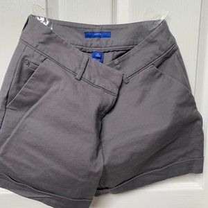 5" inseam, 98% Cotton 2% Spandex. Dark Gray.