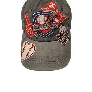 Stylish gray cap featuring vibrant baseball-themed patches. Perfect for sports enthusiasts.