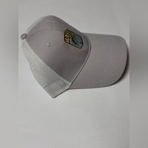 Stylish gray trucker hat featuring a Bass logo and an American flag patch. Perfect for casual wear.