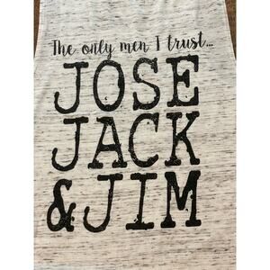 Very soft Bella+Canvas tank top in a gray and white color (White marbled). the style is a wide racer back sleeveless with a round neckline. The graphic says :"the only men I trust JOSE JACK & JIM."