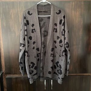 This sweater was purchased from a local boutique and does not have a brand name on it. It’s a gray and black animal print cardigan sweater. It’s well made, on the heavier weight side, 2 pockets and very comfortable. Size medium and in very nice pre owned condition. Smoke and pet free home.