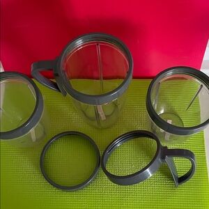 Upgrade your kitchen with this sleek gray blender cup set. Ideal for smoothies and shakes, these cups feature convenient handles for easy use. Nutribullet machine was used for display only. What is pictured is for parts, if you're still lucky to have yours. 1 larger cup with attached handle approx. 6 1/4β tall 2 5β tall cups with attached rings. 2 extra cup rings parts.