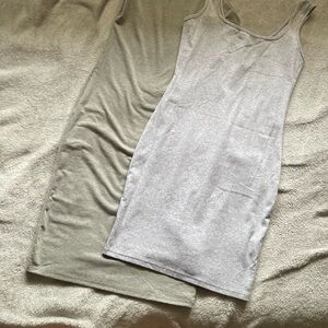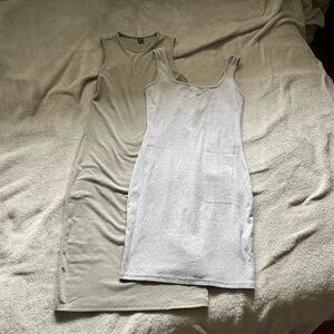 Brand new never worn, no damages or stains or rips. One is light gray one is a little darker, both are bodycon dresses! Thick stretchy fabric, definitely not see through. Good quality! Make an offer all must go. :)