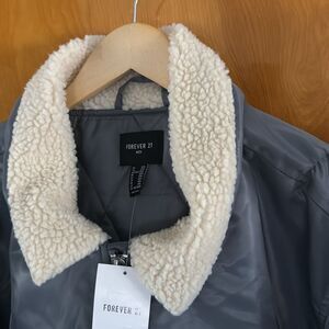 This is new with tags. The color is gray. Two side pockets. The fabric is 100 % polyester. Quilted liner. The collar is sherpa fleece. The chest is 56 inches, 28 flat. The length is 30 inches. The sleeves are 31 inches.