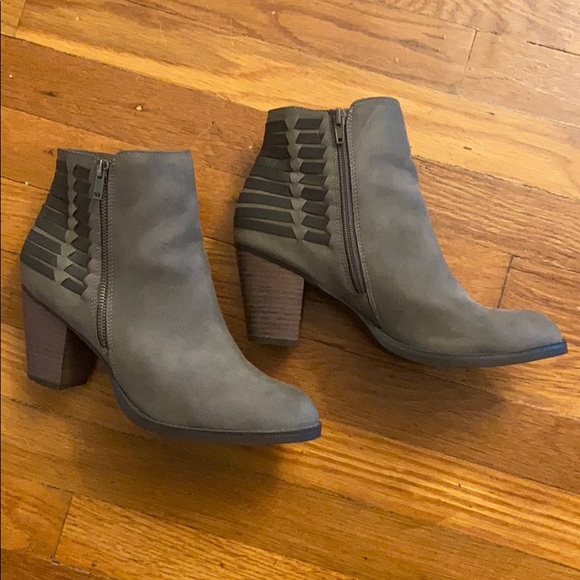 3in brown wooden heel. Gray in color w darker gray detail on back heel. Side zip, no laces.