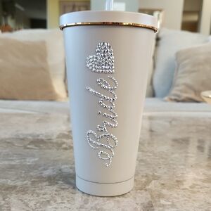 Elegant gray tumbler with 'Bride' in rhinestones and a heart design. Perfect for bridal celebrations. New, never used or given to bride. Has a small scratch on back. 7" Tall, 4" round on top.