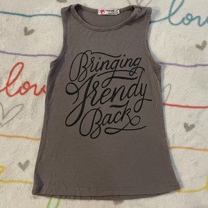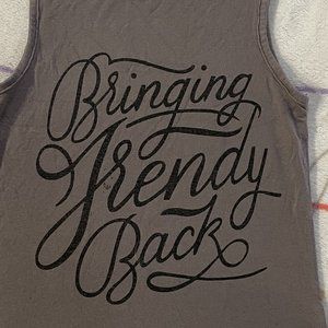 DESCRIPTION:Gray sleeve less top reads " Bringing Trendy Back"