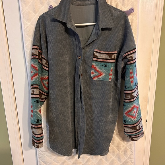 Stylish gray button down shirt featuring vibrant patterned sleeves. Perfect for adding a pop of color to your wardrobe.