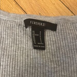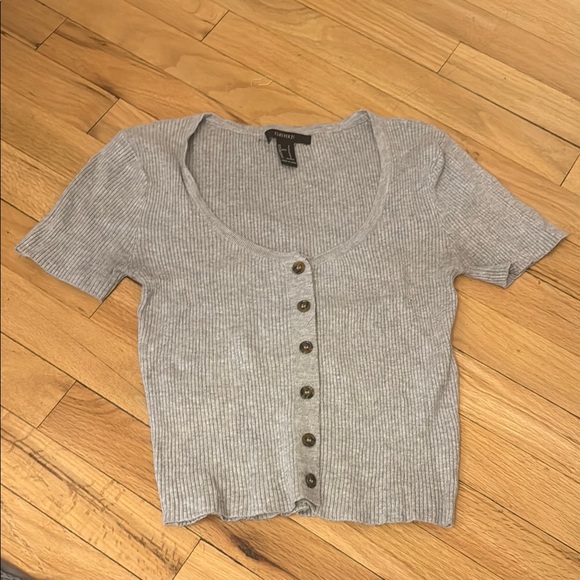 This stylish gray button-up ribbed top offers a comfortable and chic look. Perfect for casual outings or layering.