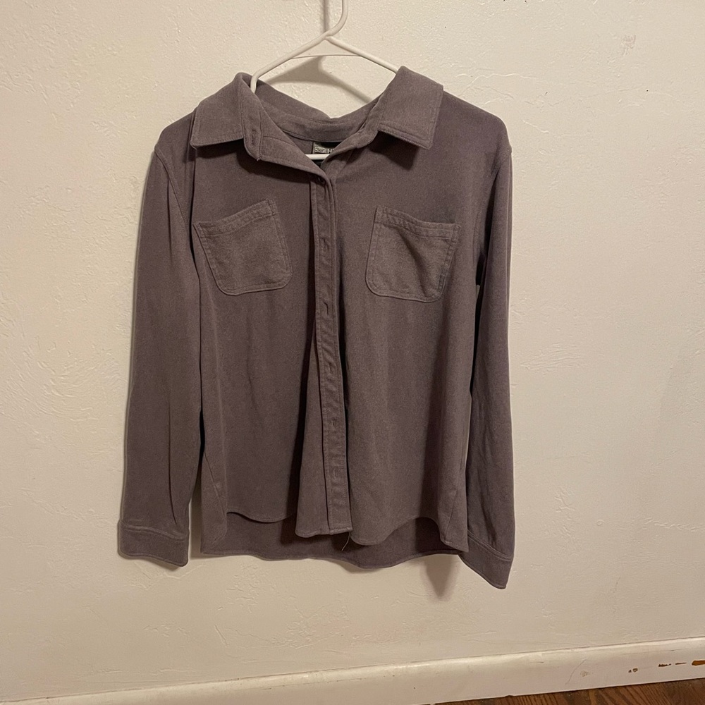 Stylish gray button-up shirt with front pockets. Perfect for casual wear. More purple irl