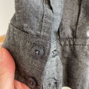 Elegant gray button-up dress with ruffle detailing. Pockets and matching belt. Minimalist w/ style. Nice fabric. 3/4 button sleeves. Side vents. Wear as dressy or casual Perfect for any occasion. EUC pit to pit 20” and shoulder to hem 35”.