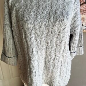 Keywords: cable knit sweater, gray sweater, pullover sweater, boxy sweater, oversized sweater, 3/4 sleeve sweater, casual sweater, knit top, women's sweater, cozy sweater, winter sweater, fall sweater, cuffed sleeve, classic sweater, relaxed fit