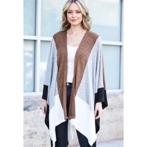 Gray and camel two toned solid color block multi colored dolman sleeve soft asymmetrical hemline cardigan