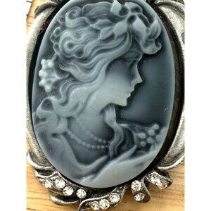 This vintage look brooch features a classic cameo design with a gray silhouette framed in antique silver tone and adorned with sparkling rhinestones.