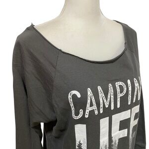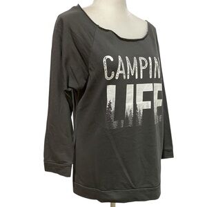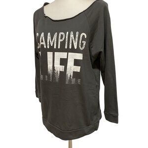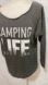 This comfortable gray hoodie showcases a 'Camping Life' design in white with a distressed effect, ideal for outdoor adventures or laid-back days. Crafted from soft fabric, it ensures a cozy fit with its classic crew neckline.