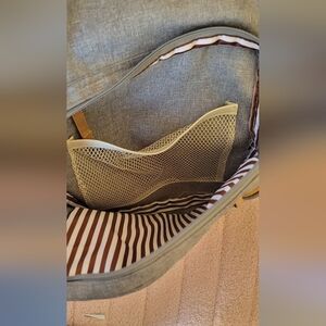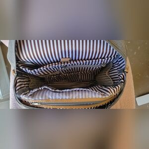 Stylish gray vegan leather diaper bag. Perfect for everyday use with multiple compartments for organization. Has a rip off one of the zipper parts but is still very functional can be easily fixed. Was only used a few times.