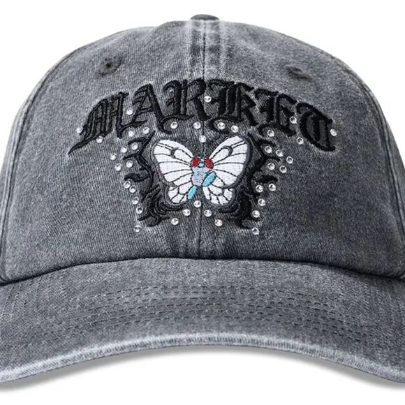 Stylish gray cap featuring a butterfly design with rhinestone accents. Perfect for casual wear.