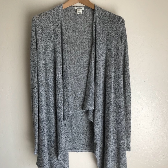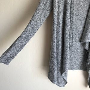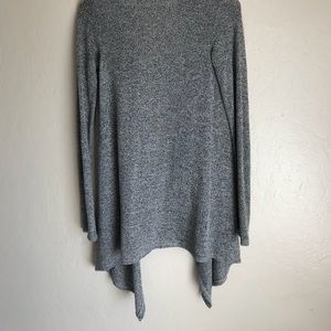 Gray speckled cardigan, longer in the front