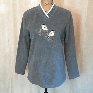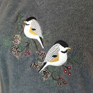 Look good and feel cozy in this long sleeve gray fleece pull-over. A pair of sweet chickadees sitting on pinecone branches are embroidered on the front. The small V-neckline is edged in creamy ivory for a cute fashion statement. Yet again, I wish I could wear my mom's size S clothing. I just love the sophistication of this casual fleece. Dress it up or dress it down. Can be worn through the Fall and Winter.