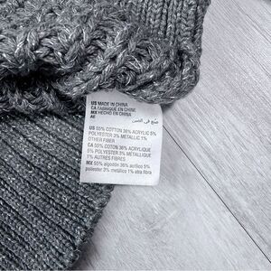 Size L charcoal gray sweater. Turtleneck style with balloon sleeves. Metallic accents in the thread. New with tags. Chest 21in. Length 25in.
