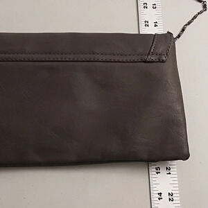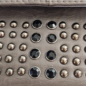Gray Vegan Leather Clutch Crossbody bag Gunmetal Studs Black Faceted Stones Removable Chain Zippered Top Magnetic Flap