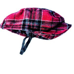 The cap is made of red, black & gray plaid (100% Polyester), with a Scottish, sport look. It is unlined, with a flat front, bill & elastic strap.