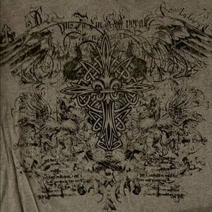 This gray short sleeve tee showcases a vintage-inspired graphic design on the front, adding a unique artistic flair. Crafted from soft cotton, it offers comfort and breathability for everyday wear. The classic crew neck style ensures a timeless look.#2