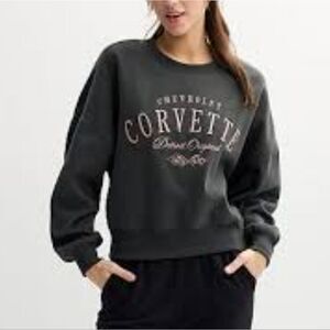 This gray crew neck sweater features a striking graphic design on the front, showcasing the word 'CORVETTE' in an arched format. The text and decorative elements are in a contrasting light pink or rose gold color, adding a touch of elegance to the dark heather gray fabric. Perfect for casual outings, this sweater combines style and comfort effortlessly.